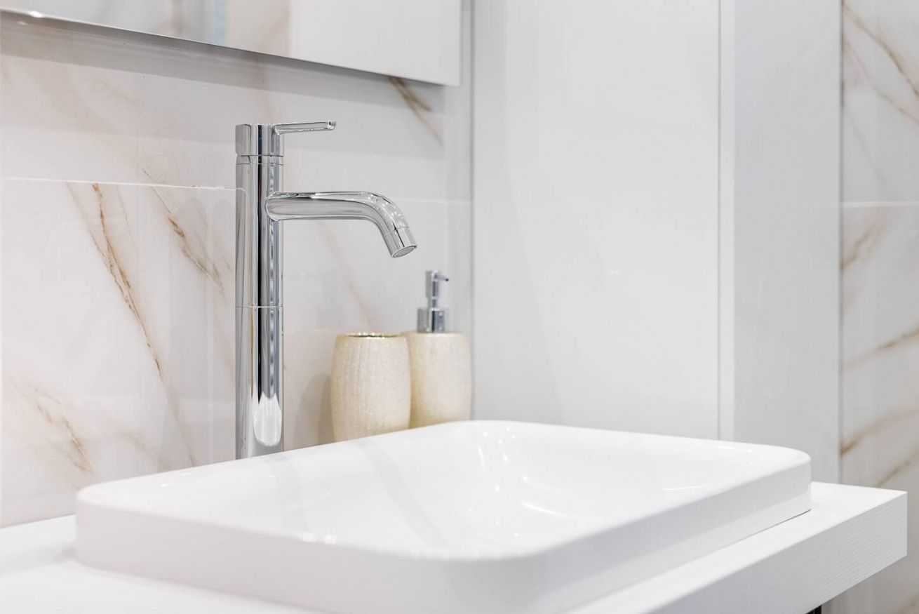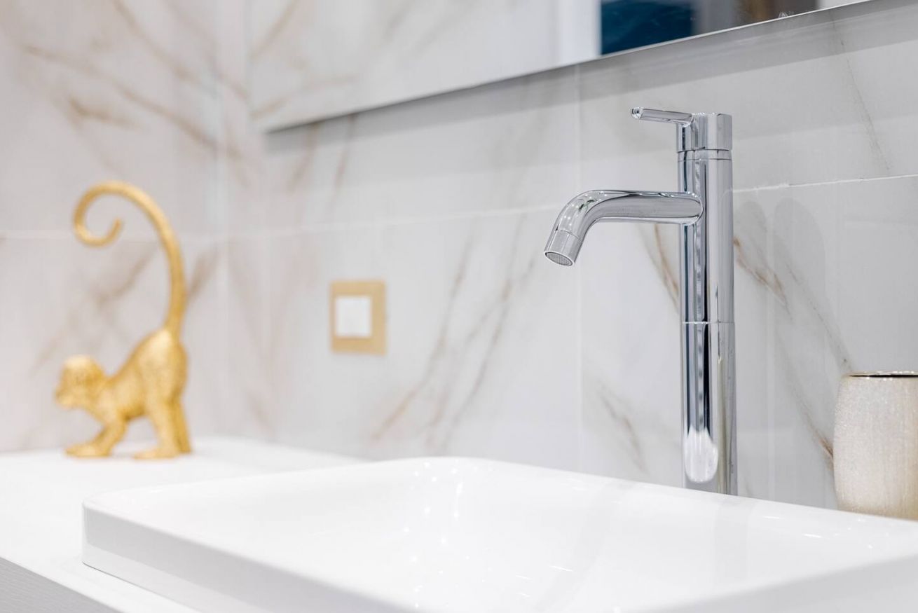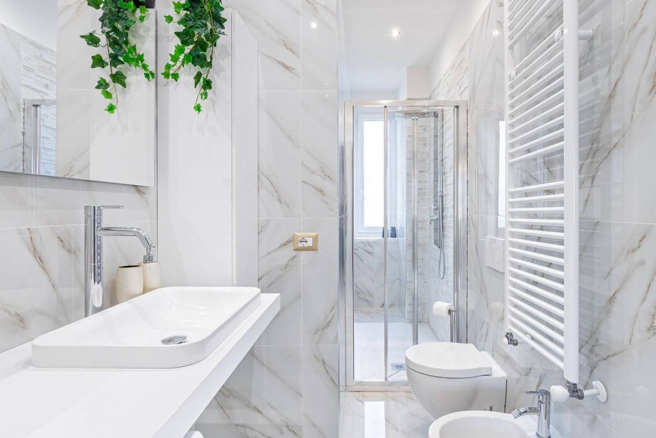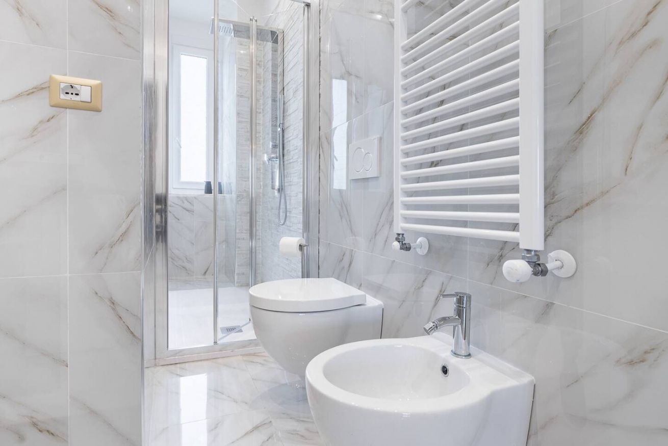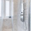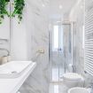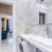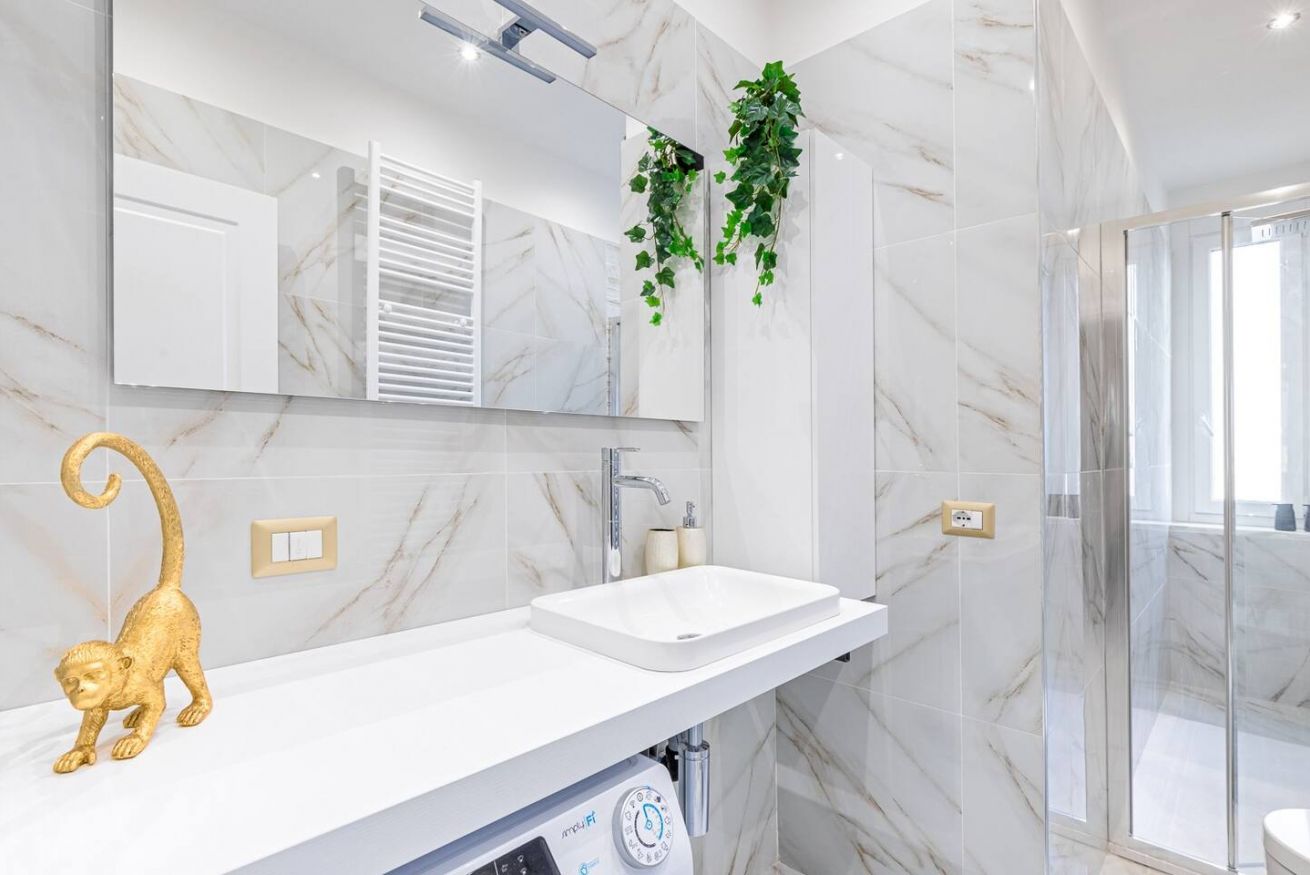 - Bagno in marmo con ampia doccia e lavatrice