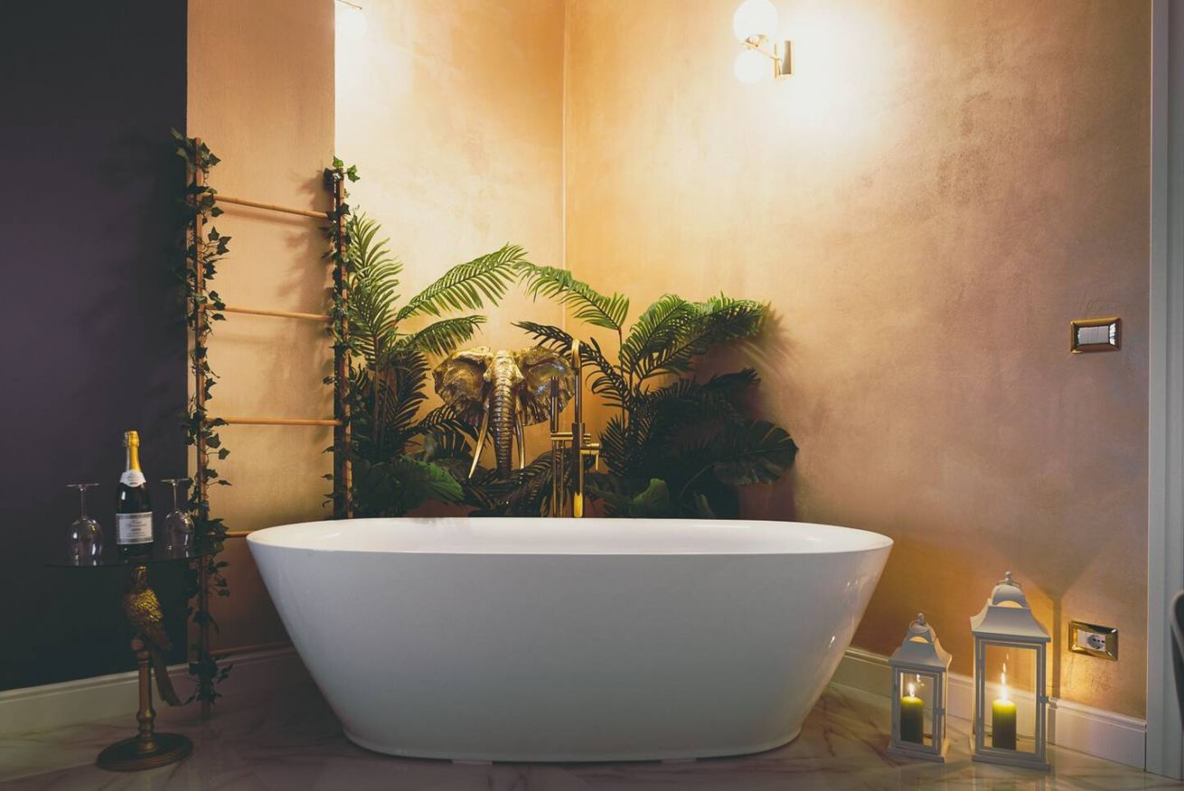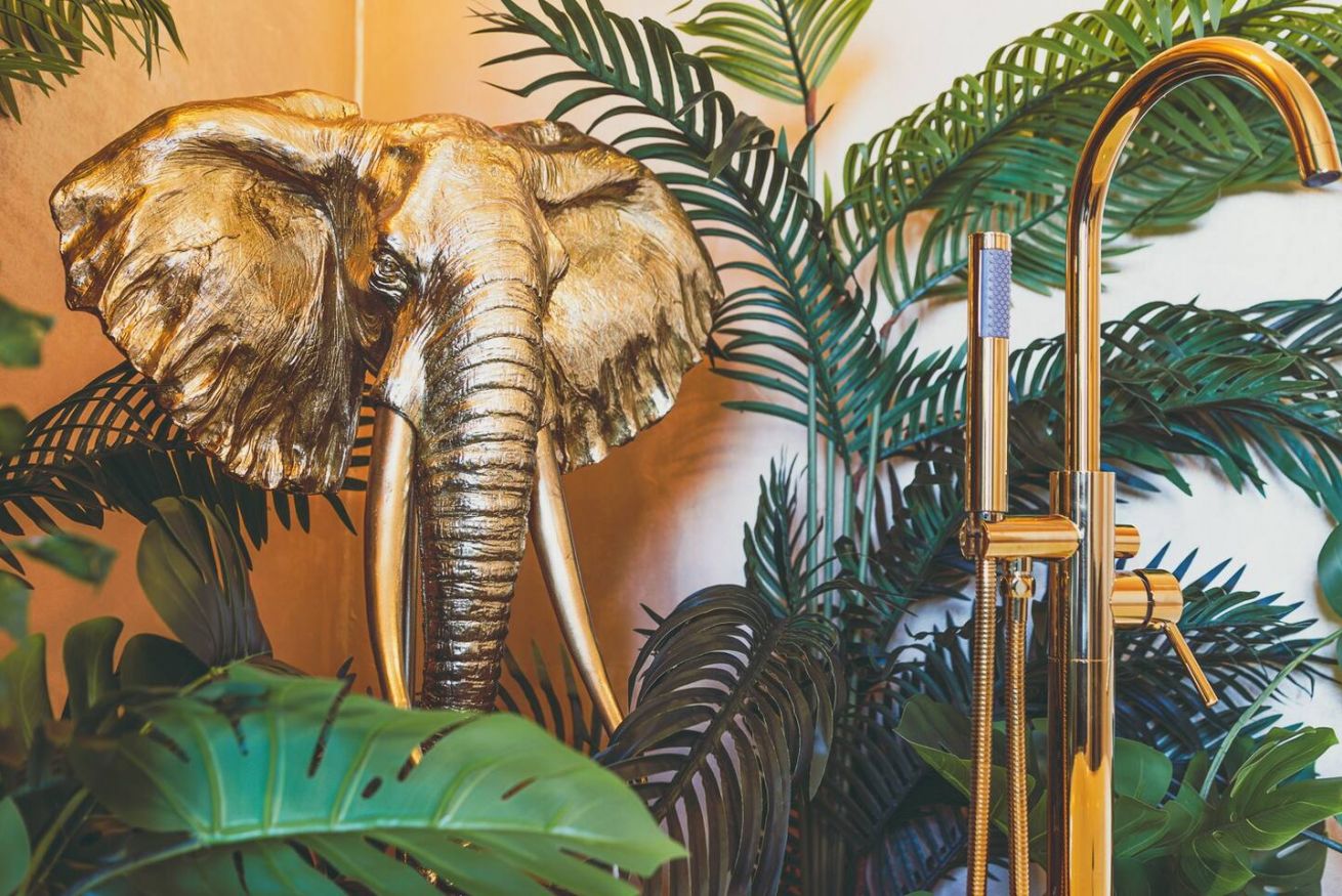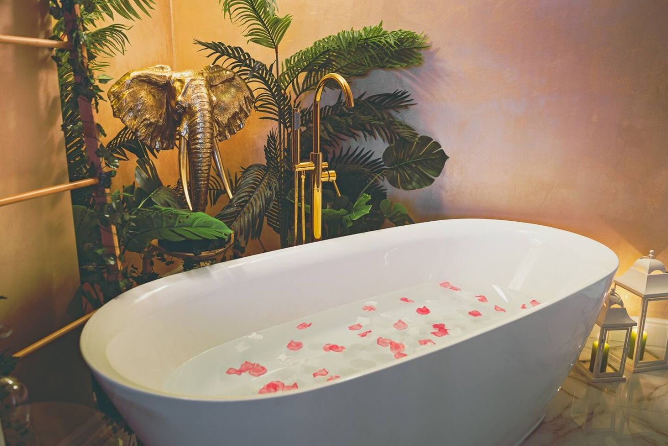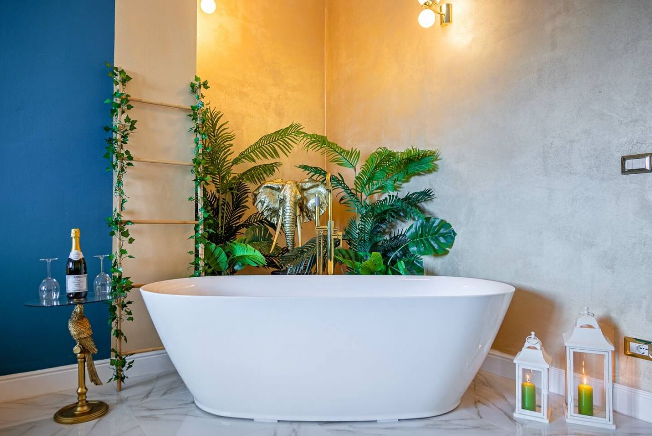 Lo stile Jungle della camera e la vasca freestanding creano un clima intimo, l'oro e il blu petrolio impreziosiscono gli spazi rendendoli eleganti e suggestivi.