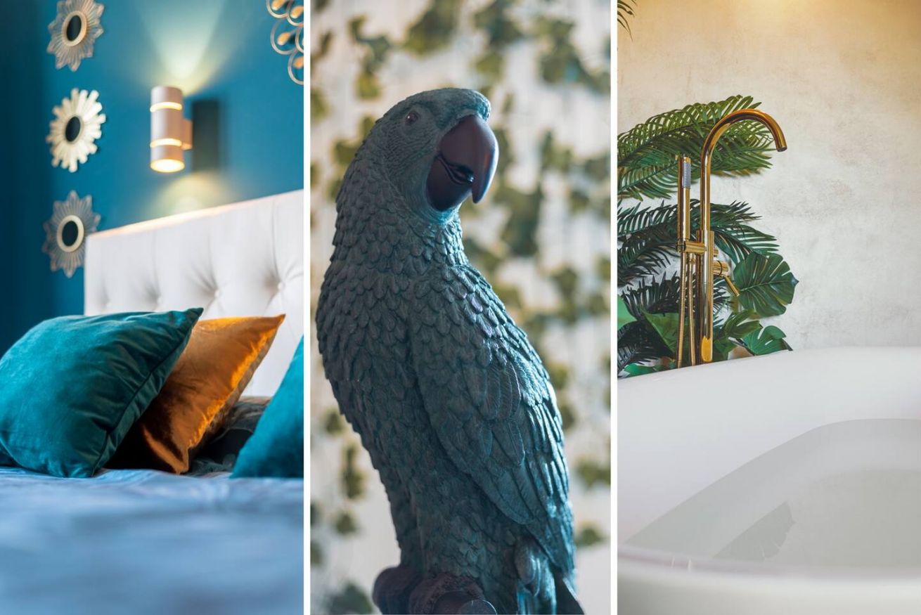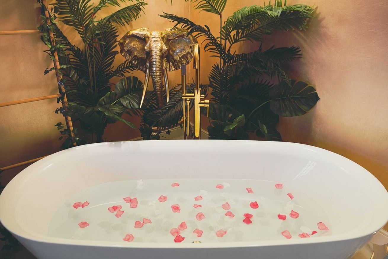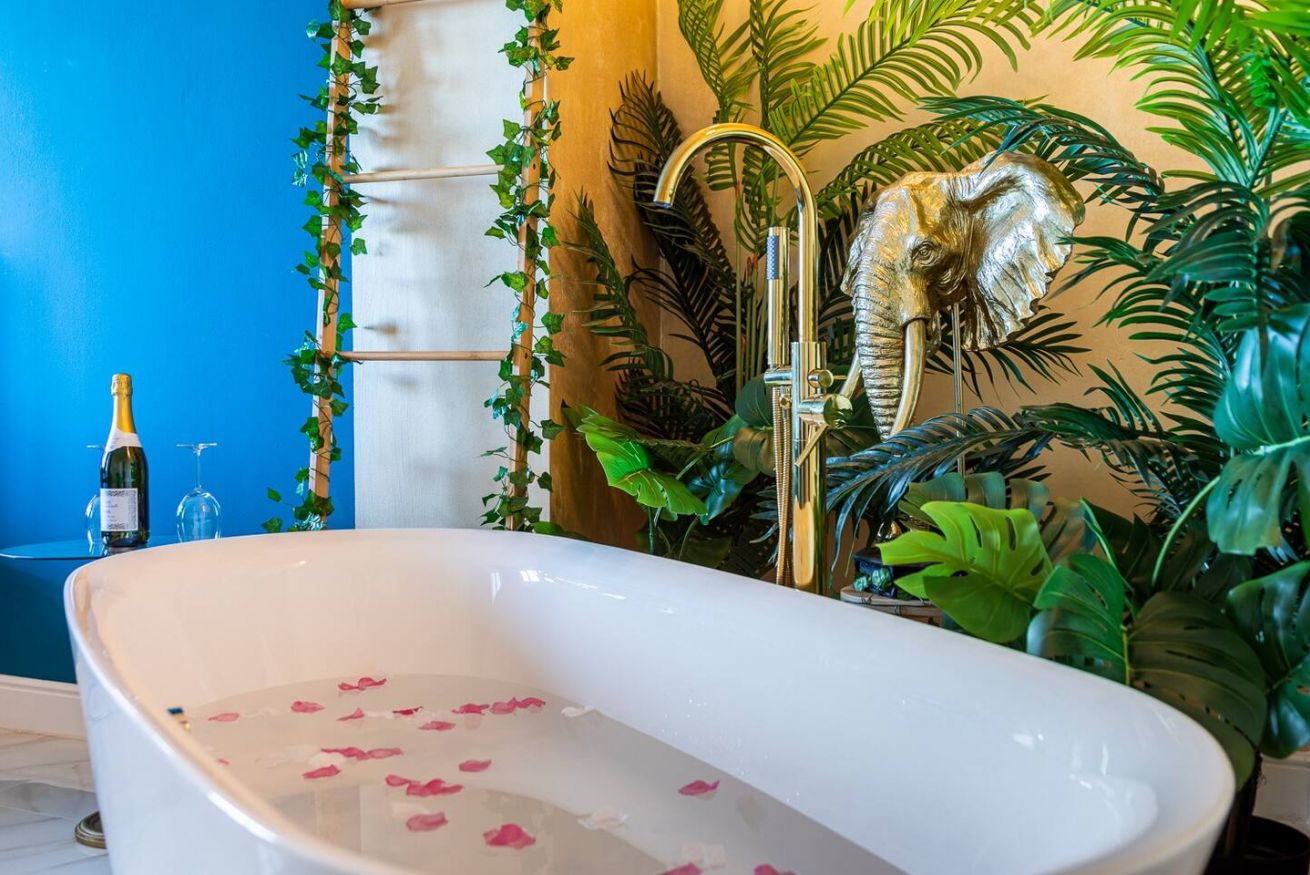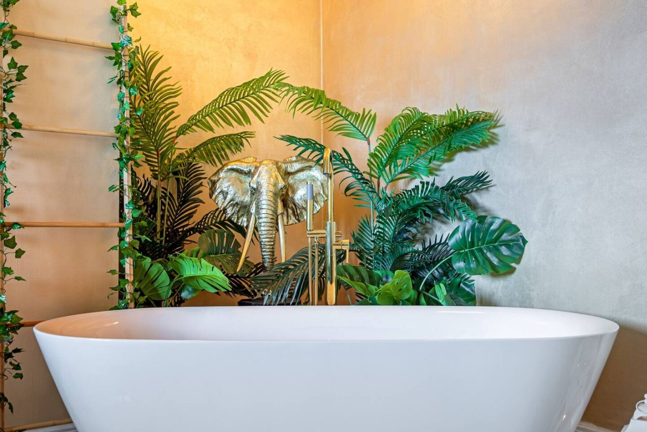 Lo stile Jungle della camera e la vasca freestanding creano un clima intimo, l'oro e il blu petrolio impreziosiscono gli spazi rendendoli eleganti e suggestivi.