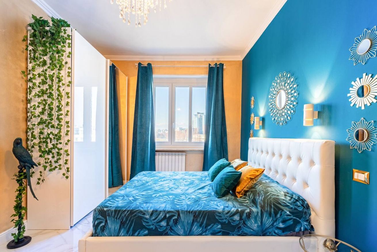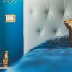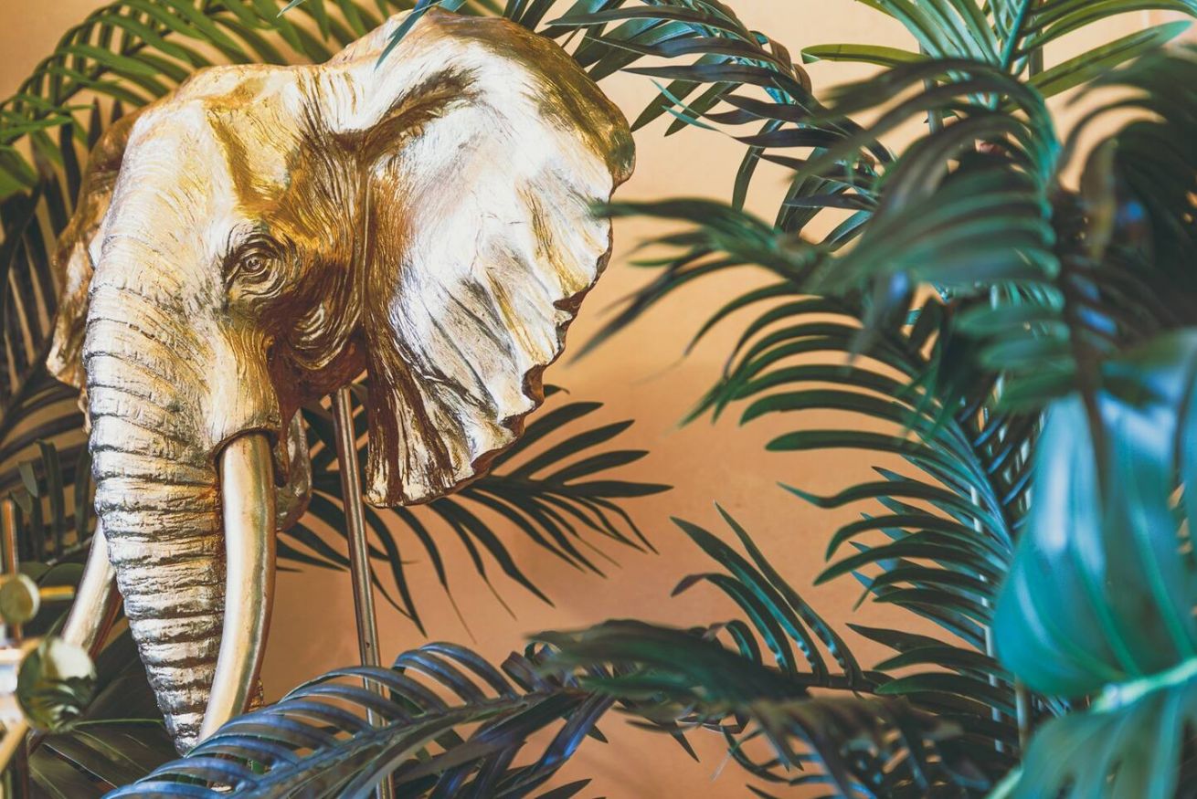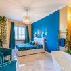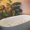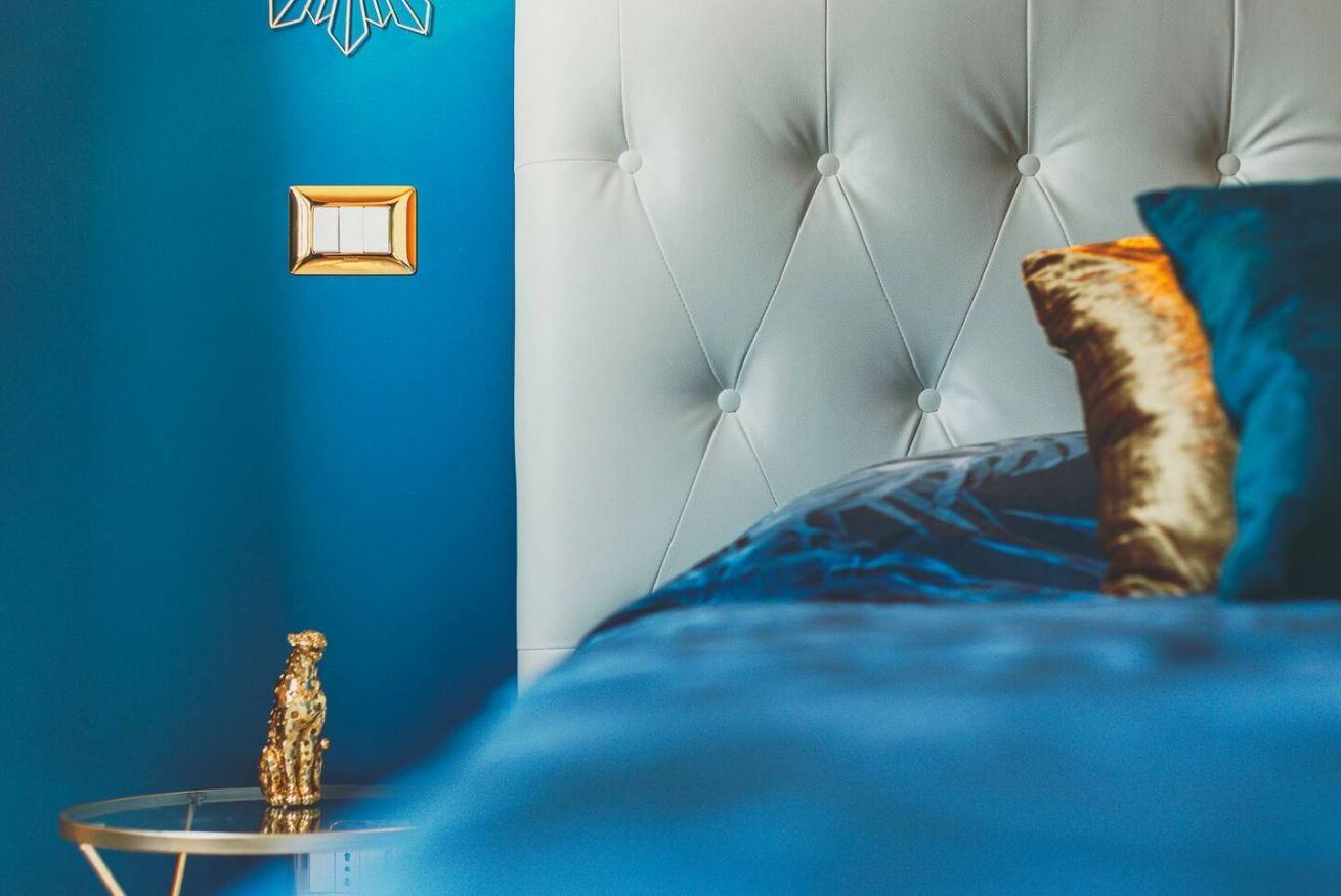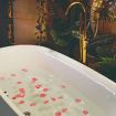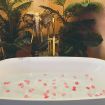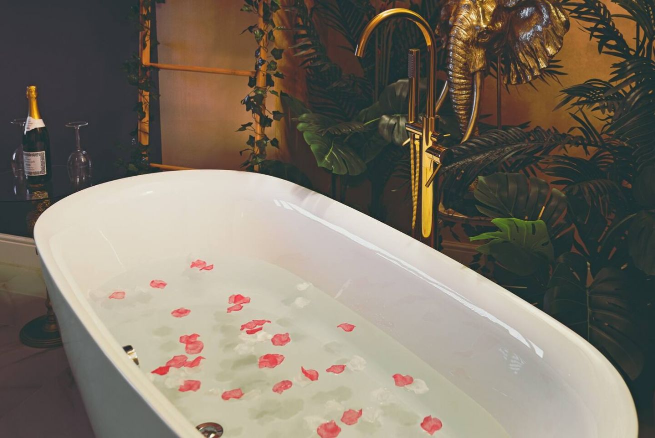 Lo stile Jungle della camera e la vasca freestanding creano un clima intimo, l'oro e il blu petrolio impreziosiscono gli spazi rendendoli eleganti e suggestivi.